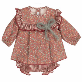 Jesusito de bebé en tono terracota con estampado floral, detalles de cuadros y lazo suave, acompañado de braguita a juego para un estilo cálido, cómodo y muy combinable en el día a día.