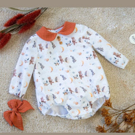 Pelele suave y práctico con estampado infantil de tonos cálidos y un cuello en color teja que aporta un toque acogedor para acompañar a diario a los más pequeños.