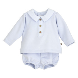 Conjunto para bebé en azul claro formado por pololo y jersey de algodón con cuello redondeado y tapeta de botones, pensado para vestir a diario con comodidad y un estilo tradicional.