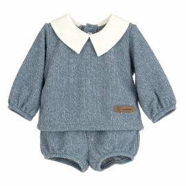 Conjunto para bebé formado por jersey blanco con cuellito de pico y pololo azul a juego, una propuesta suave, cómoda y pensada para acompañar el día a día con un estilo sencillo y cuidado.