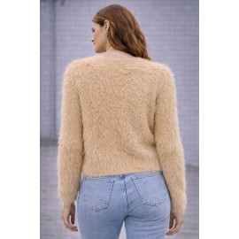 Chaqueta de punto de mujer en color gris y beige con efecto pelo suave, cuello en pico y cierre con botones, pensada para aportar calidez ligera y un tacto agradable en looks diarios de entretiempo e invierno suave.