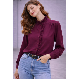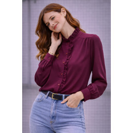 Blusa de mujer en color burdeos con cuello ligeramente fruncido y detalle de volante en el delantero, de caída suave y manga larga, pensada para vestir con elegancia natural en el día a día o en ocasiones especiales.