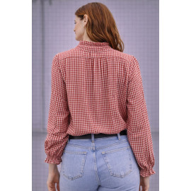 Blusa de mujer con estampado vichy en rojo y blanco, cuello ligeramente fruncido y volante decorativo en el delantero, de manga larga y caída suave, ideal para aportar un aire femenino y atemporal a los looks del día a día.