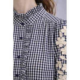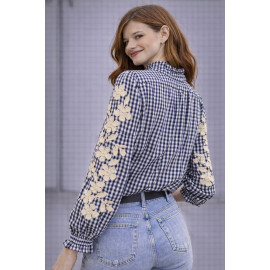 Blusa de mujer con estampado vichy en azul marino y blanco, cuello ligeramente fruncido, cierre abotonado y delicado bordado floral en las mangas, pensada para aportar un estilo femenino y cuidado a los looks diarios.