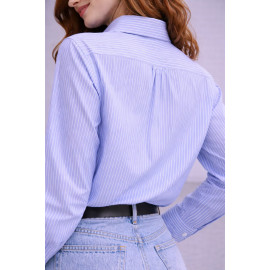 Camisa de mujer en color azul con finas rayas blancas, cuello clásico y cierre abotonado, de corte cómodo y tejido ligero, pensada para vestir con estilo natural tanto en el día a día como en looks más cuidados.