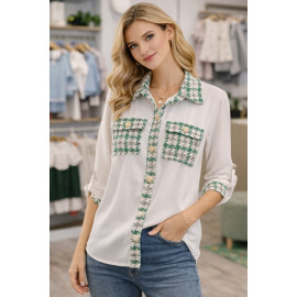 Blusa blanca de mujer con detalles en tejido estilo tweed verde en cuello, tapeta y bolsillos, una prenda elegante y actual que aporta un toque distintivo sin renunciar a la versatilidad del día a día.